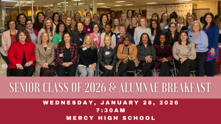 As the Class of 2026 heads into their final semester at Mercy, we are preparing to welcome them into the Alumnae Association. Alumnae are invited to host a table at the upcoming Senior-Alumnae Breakfast on Wednesday, January 28, 2026. This special sisterhood event provides an opportunity for Mercy alumnae to interact with Seniors to share experiences, insight, advice about life after high school, college, careers and more! Mercy Seniors in the graduating Class of 2026 will be seated with an alumna in a field that they have an interest in pursuing and/or college(s) they are interested in attending.