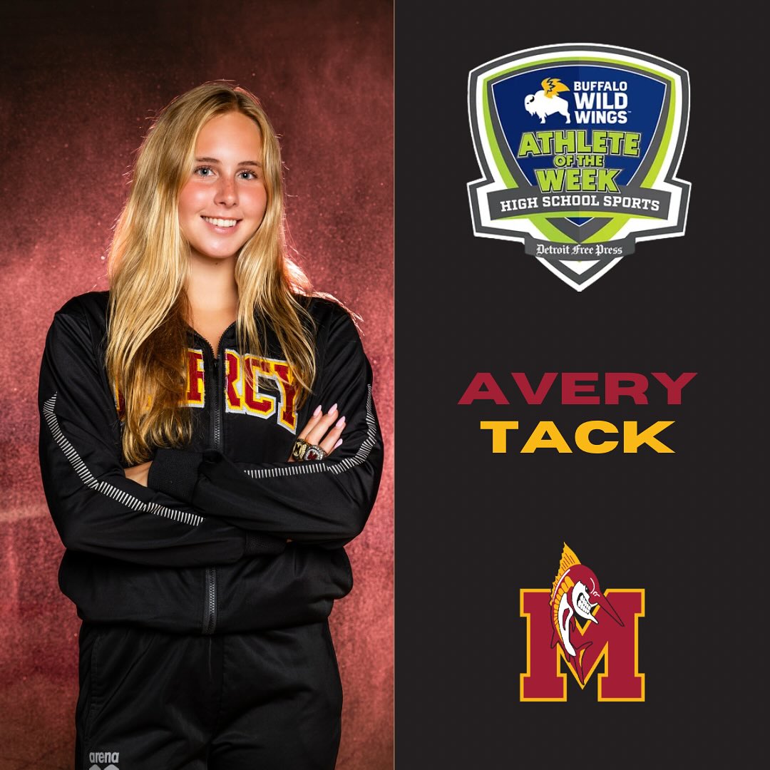 Congratulations to Swimmer Avery Tack '27 who won the Detroit Free Press Buffalo Wild Wings Athlete of the Week! She was a key part of Mercy's third straight Oakland County girls swimming championship and won the 200-meter individual medley with a time of 2:07.89. Avery was also a member of two winning relays, the 200 medley and the 400 freestyle relay, which helped Mercy win the county championship meet by over 200 team points.
