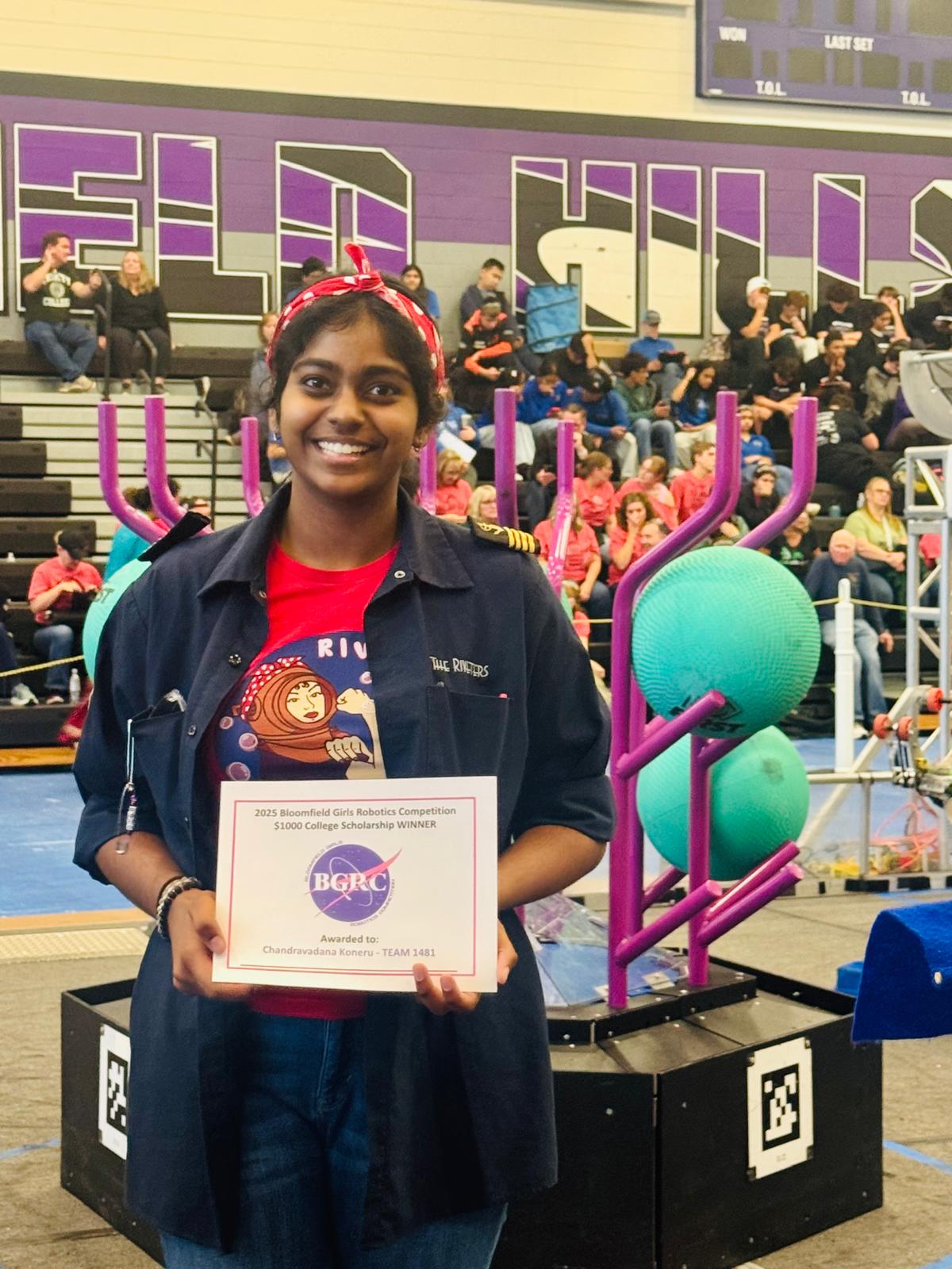 Mercy Riveters Robotics Team Captain, Student Lead, and Drive Coach, Chandravadana Koneru ’26 was honored as the first-ever recipient of the 2025 BGRC College Scholarship at the Bloomfield Hills Girls Robotics Competition. She also holds the distinction of being the first Mercy student to receive this award. Congrats Chandravadana!