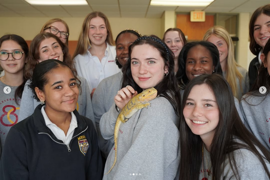 Roz is a 4-year-old bearded dragon who has been part of the Mercy High School community since she was just a baby. She is named after pioneering scientist Rosalind Franklin, and her habitat even features QR codes where students can learn more about both Franklin’s contributions and bearded dragons.