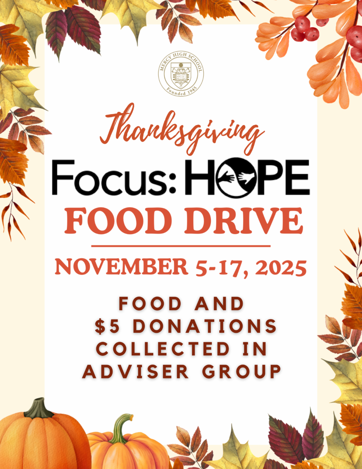 All students and staff are asked to bring in select food items to donate along with a $5 contribution toward perishable items. Food donations will be collected in Adviser Group until Friday, November 14 along with Monday, November 17 for produce brought in by 8:00am. Mercy is proud to be one of Focus: HOPE's largest donors. THANK YOU for helping us make this a successful food drive!