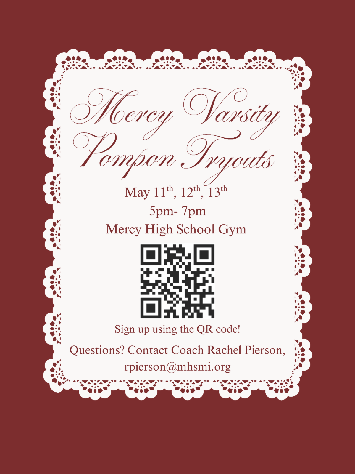 Mercy Varsity Pompon 2026-27 tryouts will be held Monday, May 11 - Wednesday, May 13 from 5:00pm - 7:00pm. Register for tryouts here. Parents are asked to please attend the team info meeting on Monday, May 11 at 5:00pm. Questions? Email Coach Pierson at rpierson@mhsmi.org.