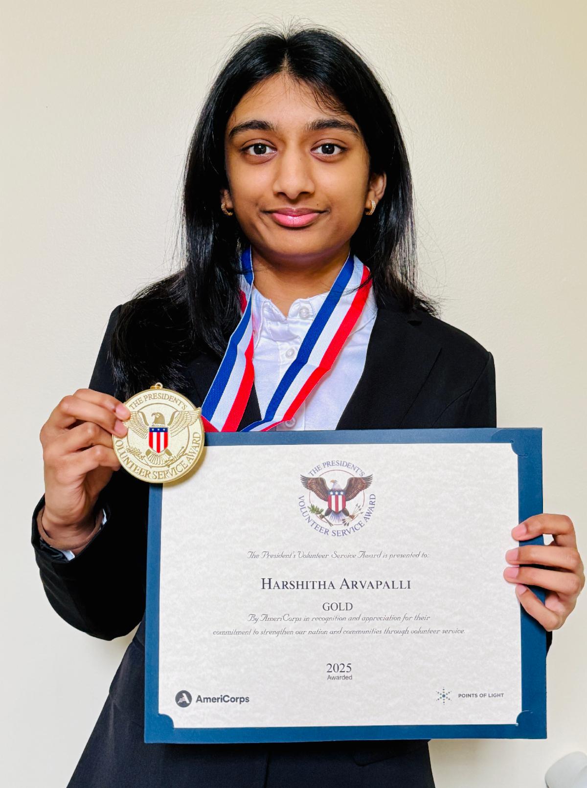 Congratulations to Harshitha Arvapalli '27 who received the GOLD Presidential Volunteer Service Award presented by AmeriCorps for the 2024-2025 year. This prestigious award honors those who show outstanding dedication to volunteer work and make a meaningful difference in their communities.