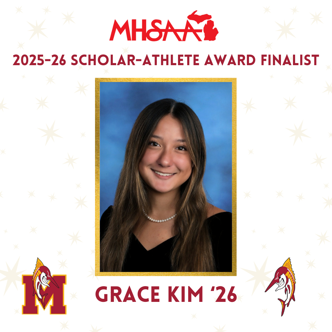 Congratulations to Grace Kim '26 on being named a 2025-26 MHSAA Scholar Athlete Finalist. Grace is one of 120 finalists out of 1,438 applicants! Class A award winners will be named on February 17 and will receive a $2,000 scholarship from Farm Bureau Insurance.